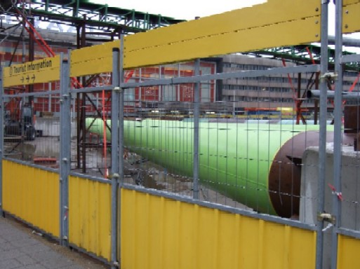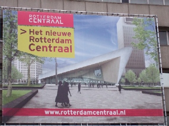 | 現在、ロッテルダム・セントラル駅前で大規模な工事が行われており、新しいイメージ図(写真左および中央)が駅前に大きく掲示されております。現状では、トラム・バス・自動車・歩行者等が入り乱れていますが、地下化にすることにより緑をともなった歩行者スペースに変更されるようであります。併せて駅舎部も斬新なデザインになるようであります。写真右は地下工事の支保工を撮影したところですが、オランダではH型鋼ではなく鋼管を用いているようであります(Geo Engineer向け情報も参照ください)。 | ||