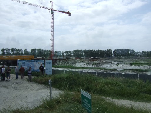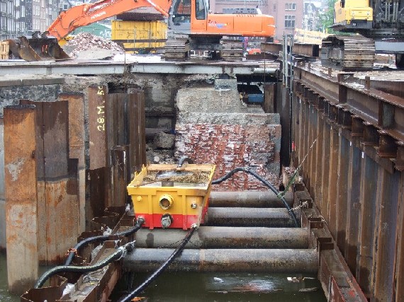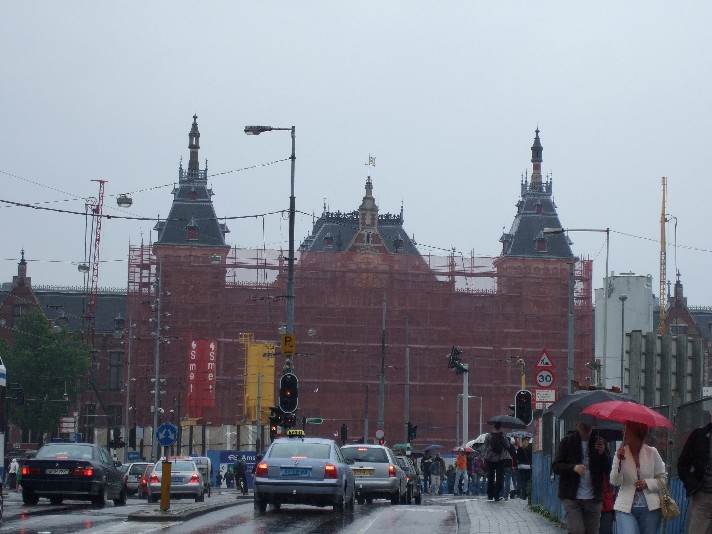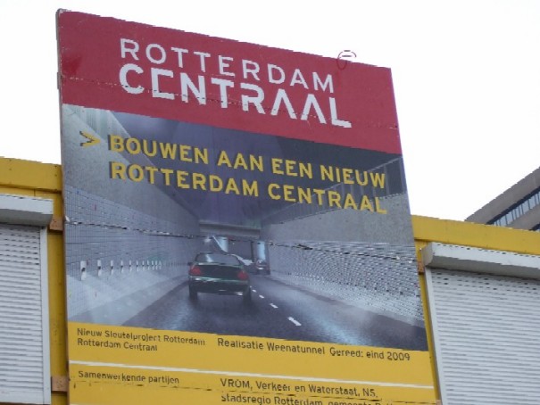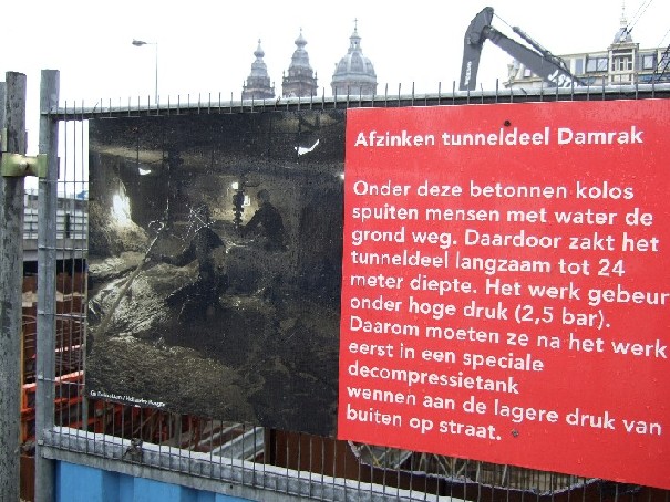 | 現在、アムステルダム中央駅も改修工事中でありました。アムステルダム駅は、東京駅がモデルにしたといわれており赤レンガがとても印象的な駅舎で、なんと約9000本の木杭によって軟弱地盤上に支えられております。このアムステルダム中央駅の下に地下鉄北南線の工事が2012年の開通に向けて行われております。この工事は駅舎等の歴史的な構造物に影響を与えないように行われており、写真中央は地表面からの開削で建設を進めているところです。また写真右側の看板は、地下掘削で地下水の影響を受けないように地下室の気圧を2.5気圧に上げて掘削工事をしている事を写真付きで説明されております。アムステルダムも変わります。 | ||