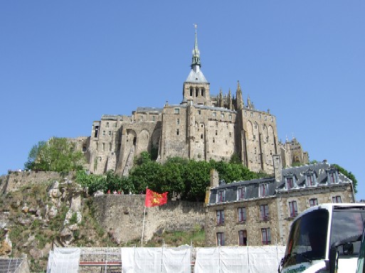 | 708年に大天使ミカエルに捧げる教会として建設され、その後、修道院・要塞・監獄とその姿を変えてきたそうであります。特徴は、湾の中の小島に建てられていることで、湾の干潮と満潮の差が15メートルもあり、干潮の時に人々は歩いて渡ることができたそうです。しかしながら1865年にオランダからの技術により運河や車の通ることのできる堤防(写真中央)が建設されたことにより、河川の流れが変えられ周囲への砂の堆積が加速されるようになり、陸地化が急速に進行している状況です。1995年に従来のモン・サン・ミッシェルを囲む砂州と海の景観を取り戻すために大プロジェクトがスタートしました。写真右がその工事風景で、クースノン川にダムを築き堆積した砂を沖に流す役割の再生を目的にしております。また、写真中央の堤防を壊し橋を造ることにより、潮の流れを元に戻す計画だそうです。自然環境の再生には、多額な費用と長い歳月がかかりそうです。 | ||