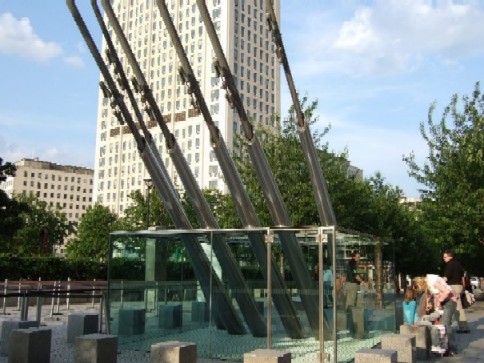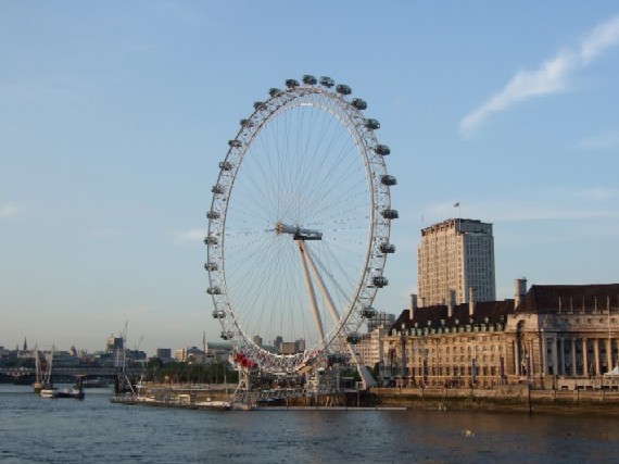 | 1999年の12月31日にオープンしたロンドン・アイ。世界最大の観覧車で25人乗りのカプセルが32個ついており、高さは135メートルに及びます。当初は5年間だけの営業許可だったそうですが、今やロンドンの主要な観光施設となり恒久的な施設として地元の同意を得たそうです。各部品の製作をオランダの会社が担当し、ロンドンで組み立てをしたとのことです。注目したいのはその構造形式です。写真中央にあるように2本の足と6本のワイヤーケーブルだけで支持されております。写真右はワイヤー部分を撮影したところです。総重量2,100トンにも及ぶ構造物をこれらでしっかりと支えております。とてもユニークな構造だと思いませんか?もちろん今後はメインテナンスが重要になってきますね。 |
