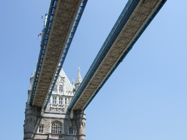 | 土木構造物といえばやはり『橋』が代表ですね。誰もが知っているタワーブリッジは1894年に完成したテムズ川に架かる跳開橋です。40メートルもあるタワー内部はミュージアムになっており、橋の歴史のビデオや写真、建設された当初使われていた水力式発電装置(現在は電力を使用しております)なども見ることができます。もちろん塔と塔を結ぶ連絡通路(写真中央および右)を歩くこともでき、テムズ川の上からの景色はとても素晴らしかったです。私にとって多少違和感のある橋の色は、1977年に女王陛下の25周年を祝してチョコレート色から塗り替えられたそうです。 |