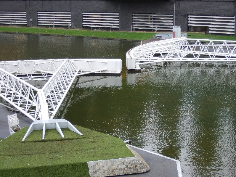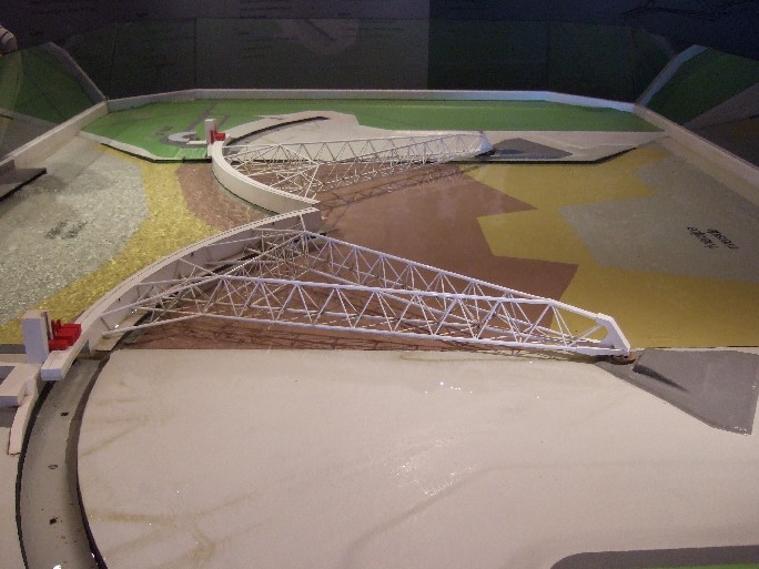 | オランダは国土の半分以上が海面下にあるという特徴を有しております。1953年に北海から発達した低気圧により、高潮が発生し、オランダ南西部のおよそ20万ヘクタールの土地が浸水し、4500戸の建物が流され、10,000頭の家畜が被害に遭いました。そのときの死者は1853名という大災害でありました。 その後、この教訓を生かし二度と同じ被害を起こさないようにと、1957年にデルタプランが実行されてきております。デルタプランは、高潮に対して川をふさいでしまうというものです。 1997年に完成したマースラント洪水バリアの全体像(模型)は左の通りです。平時はバリアは開いた状態で川の両岸に収納されており、船が航行することができるようになっております。水位が上がると高さ22メートル・幅210メートルのバリアが両岸から出てきて360メートルの川幅をふさぎます。上流には世界最大級の貿易港であるロッテルダム港(ユーロポート)があります。 |