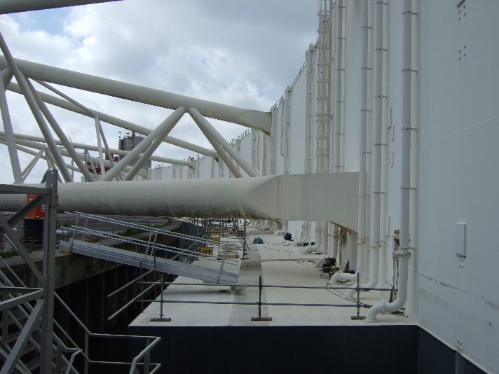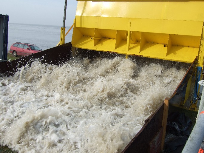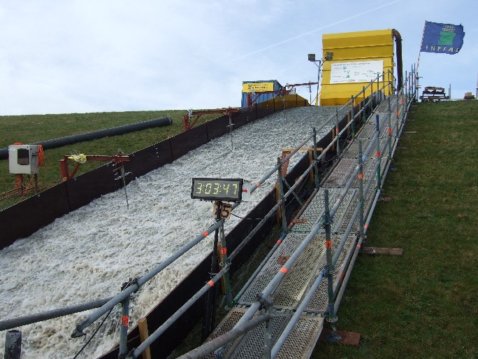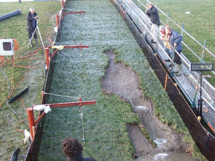 | 海水面より低いオランダの土地を守るためには堤防の安定が最も重要になっております。フリースラントの海岸の堤防で堤防の安全性を検証する実験を視察させていただきました。キャナルから汲み上げられた水を黄色い容器の中に貯めて、周期的に堤防の上から流していく実験です。堤防を越流する流れを想定しているものだそうです。5メートル程の実際の堤防を使用した実験を6時間にわたり繰り返し水を流しており、流速や水深データ計測と斜面の状況変化を観測しておられました。植生の違いによる被害状況を調べることも重要な検討課題になっているそうです。そう言えば、夏までルームメートだった研究員の方が、一生懸命に植物の根の本数を数えながら強度試験をしていたのを思い出しました。 | ||