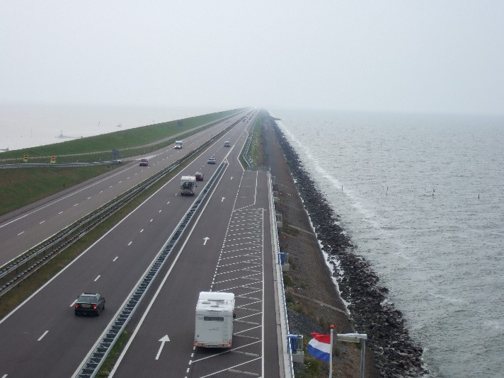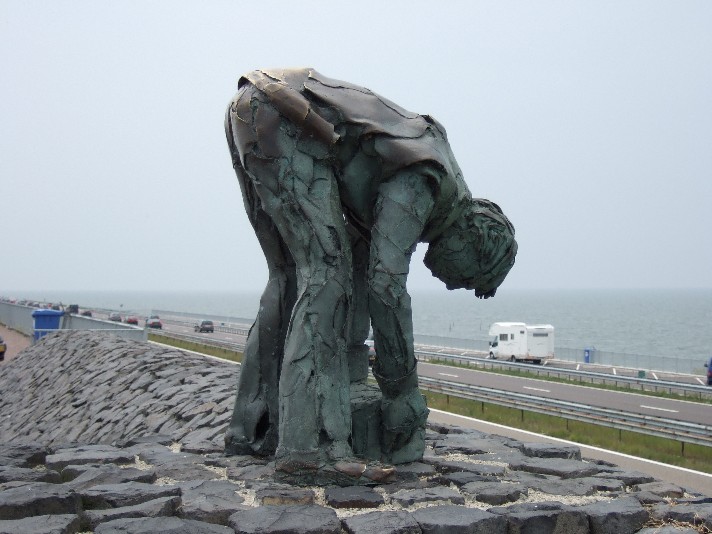 | オランダでは常に水害の危機に直面しているため、この30キロメートルにも及ぶ大堤防(Afsluitdijk)が1927年から1933年にかけて建設されました。この大堤防によりゾイデル海が淡水化してアイセル湖となりました。さらにアイセル湖では5つの干拓事業が計画され4つの地区で1.7万ヘクタールが農地として造成されましたが、残る一つは財政上の問題と干拓後の使用目的から凍結されております。そしてちょうど今年が締め切りが完成して75年目を迎え記念イベントなども行われていました。デルタプランで紹介した1953年の高潮ではその威力を見事に発揮したそうです。建設当時の貴重な映像がこちらからご覧になれます(オランダ語のみです)。 表層の法面護岸は人力で石積みが行われ、その姿をモニュメントとして、大堤防の中央に位置するパーキングに見ることができます(写真右)。また、石と石の間に柳を挟み込む伝統的な工法で自然環境にも配慮されております。 まさに水と闘って国土を獲得してきたオランダの象徴です。 |