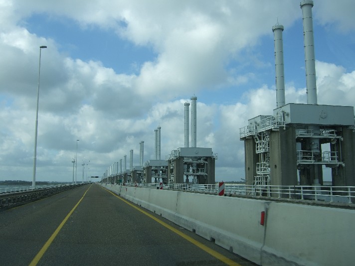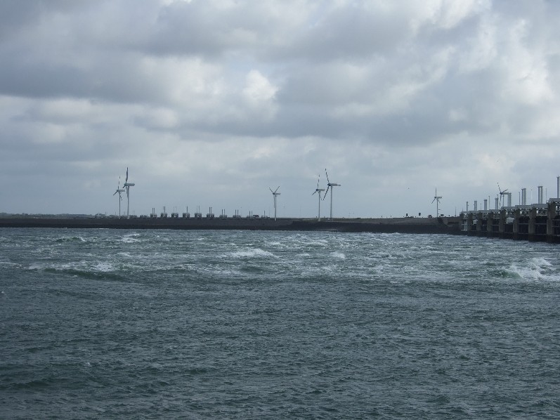 | 1957年からデルタプランが実行されてきておりますが、写真は1986年に完成しました東スヘルデ洪水バリアです。デルタプロジェクトのなかでもっとも巨大で高額の費用を要したバリアで全長が9キロメートルに及び10年の建設期間を要しました。当初は完全に締め切ってしまう計画で建設が進みましたが、生態系への影響が問題視されるようになり、洪水時だけ水門を閉める可動堰に一部分が変更されました。 また、写真中央のように可動堰の上は道路となっており、対岸へ渡ることができます。周辺には発電用の現代の風車が数多く並びます。(写真右) |