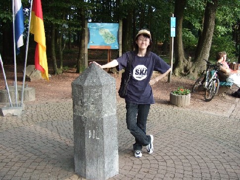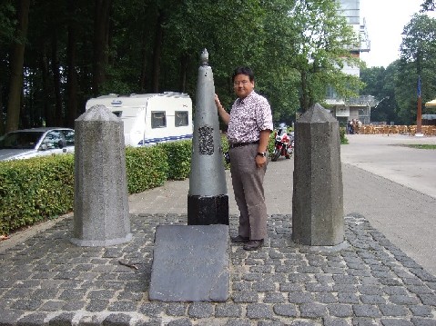 aan de IJssel (どこにあるかわかりましたらリポートします)で標高基準点よりも6.74メートル低いそうです。 写真右は、最高点の近くにあるドリーランデンプントで、オランダ・ドイツ・ベルギーの国境が1点で交わる場所に建てられた石柱です。展望台や遊園地もあり、大勢の人で賑わっておりました。 |