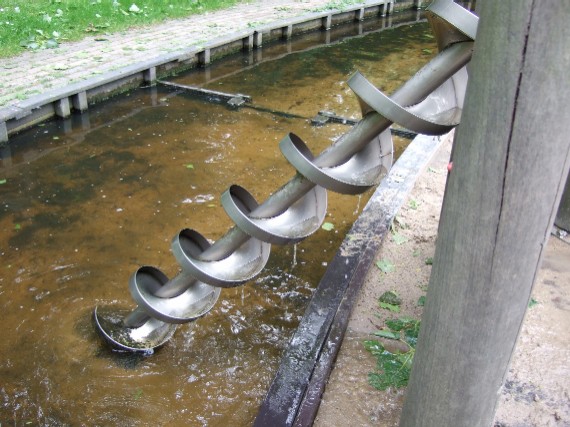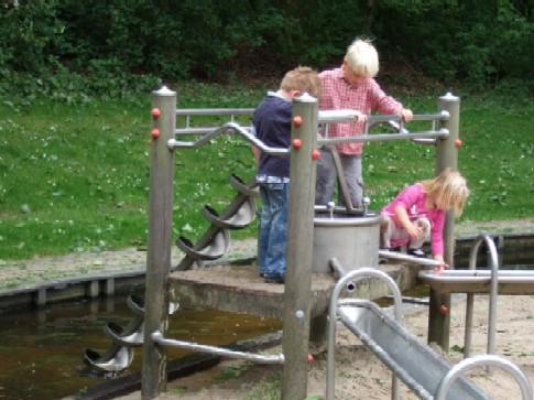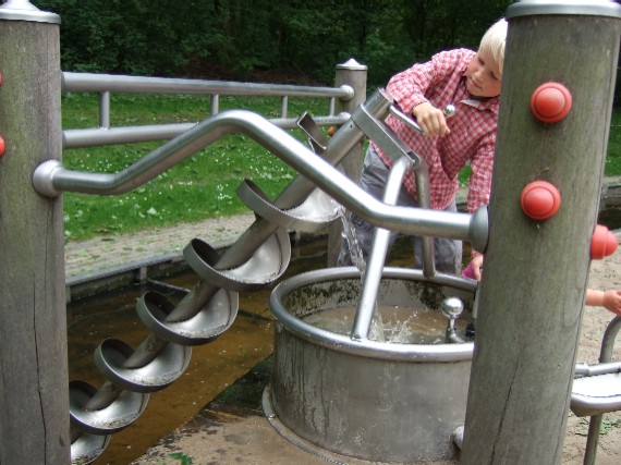 | デルフトにある公園で面白いものを見つけました。公園にはブランコや船の形をした遊具もありましたが、私が着目したのはこれらの写真で、子供たちは一生懸命にスクリューを回転させて遊んでおります。これは、キンデルダイクで見たスクリューのミニチュアであります。子供たちは水路から一生懸命に水を汲んで遊んでおりました。水路に囲まれた陸地で生活するオランダの人々にとっては、運河の水位は非常に重要です。子供の頃から水を汲む仕組みを学んでいくのですね。なるほど、なるほど。 |