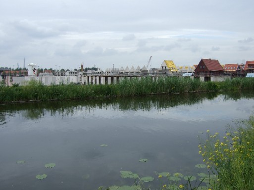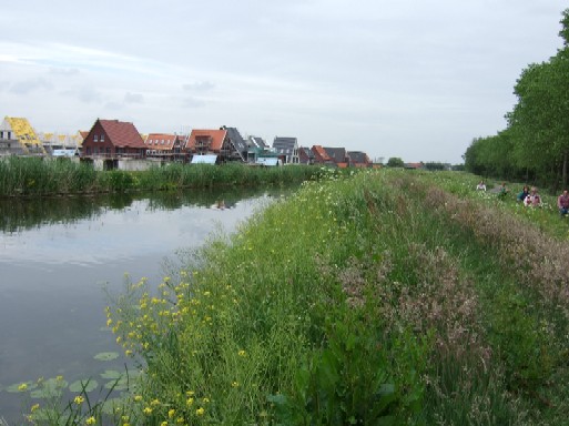 | オランダといえば・・・の第2弾です。デルフトの町を散歩していると緑で覆われた丘が見えました。何気なく上ってみると水路(運河)となっておりました。よく見ると歩道の高さよりも水面の方がはるかに高い位置にきております。写真右では新しく住宅街が建設されておりますが、やはり水位よりも低い位置です。オランダ人の好きな言葉に、「神が地球を造ったが、オランダを造ったのは、オランダ人だ」というものがあるだそうです。オランダは、国土の40%が埋め立てによって造成されたもので、人が住む地域のほとんどに当たるそうです。さらに国土の1/4が海面下にあります。まさに「オランダ人が造った国家」なのであります。 | ||