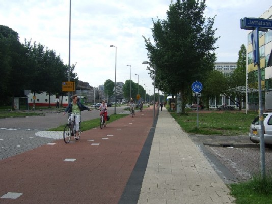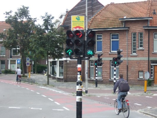 | ご要望にお応えしましてご報告をさせていただきます。 オランダでの自転車事情を知りたいとのメールが来ましたので、可能な限り調査して参りました。3枚の写真はデルフト市内の自転車専用道路であります。日本では、歩行者が最優先に感じますが、オランダではやはり自転車が最優先であるように感じます。専用道の整備・専用信号(写真右)の整備が整っております。ちなみに左の写真からも分かるようにここでは自転車も一方通行になっており、自動車と同じく右側を走ります。また、左折用にもレーンが存在いたします。中央の写真からも分かるように、自転車に乗る人のほとんどが、曲がる際に手信号で合図を致します。感心します。ちなみに私の通勤は健康のために自転車ではなく徒歩通勤です。 |