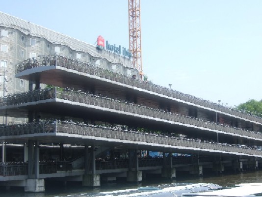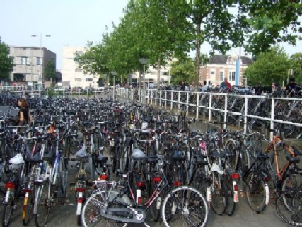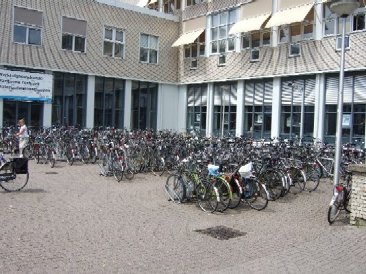 | ご要望にお応えしましてご報告(その2)をさせていただきます。 写真左はアムステルダム中央駅付近にある4層式の駐輪場であります。日曜日に調査に行ったのですが自転車で満杯な状況であります。写真中央は、デルフト駅前の駐輪場を撮影したものです。やはり数多くの自転車が止めてありました。最後に、写真右はデルフト工科大学の駐輪場であります。学生は校舎の前まで自転車で行くことができ、目の前に自転車を止めます。いずれの写真からも分かるとおり、やはりオランダは自転車王国であります。これも国土が平坦で坂道がほとんどない事が大きな原因であるように感じます。繰り返しますが、私は、健康のために徒歩で通勤しております。(オランダでは自転車はとても高価であります) |