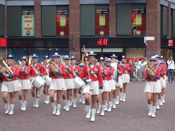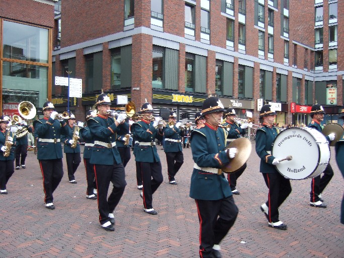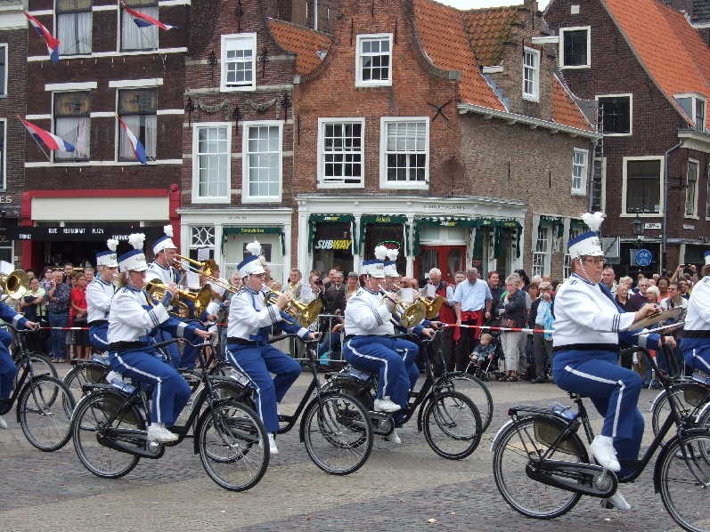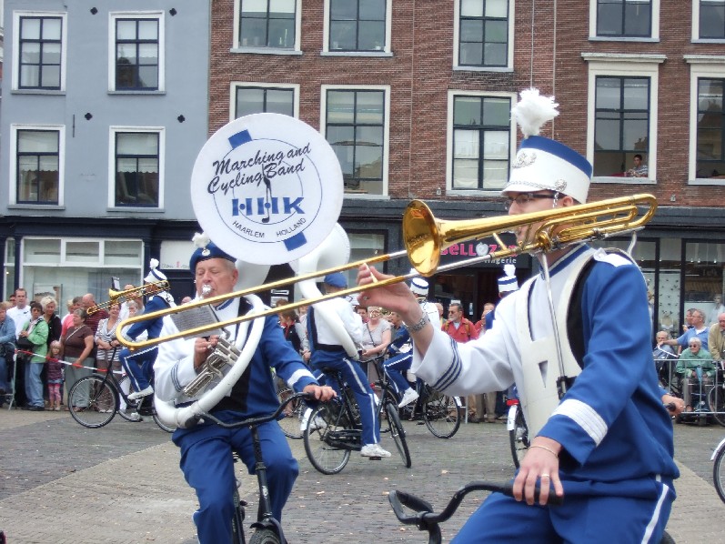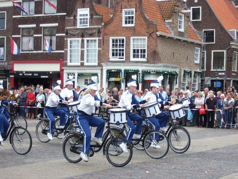 | デルフトにおいてマーチングバンドのフェスティバルが開催されました。5団体が参加し、マルクト広場でのドリル演奏とその後に市内のパレードが行われました。 非常に興味を持ったのは、さすが自転車王国のオランダならではのマーチングバンドがありました。演奏者が自転車に乗っております。スネアドラムも自転車に固定されており、トランペットもトロンボーンもスーザフォーンも片手で運転して演奏しておりました。さすがに両手を使って演奏する木管楽器の人はいませんでしたが、観客から大きな拍手を受けておりました。個人的には「楽器を壊さないように注意してね。」という気持ちで見守っておりました。 |