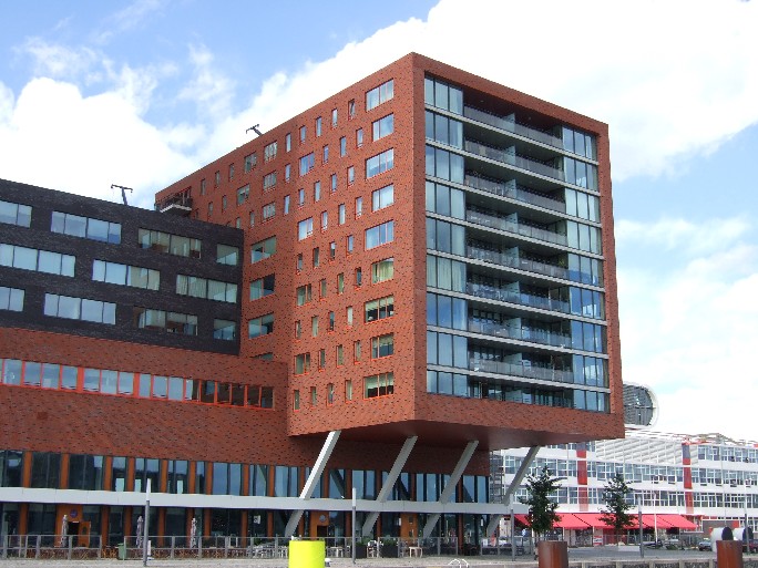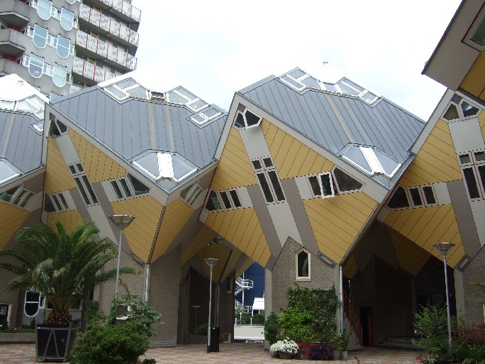 | 第2次世界大戦で荒廃したロッテルダムには新しいデザインの建築物が数多くあります。また、今年はロッテルダム建築イヤーだそうで、様々なツアーが企画されております。写真左は有名なキューブハウスです。家の中の様子も公開されておりましたが、住みたいとは思いませんでした。写真中央は新マース川岸にあるビルですが、強風に耐えるためでしょうか?棒で支えられた形になっております。写真右は張り出しているビルですが、この形の建物を他にもよく見かけます。個人的にはいずれもあまりよいとは思いませんが、専門家が見ると・・・なのでしょうか。 |