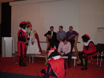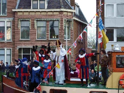 | デルフトに11月の末にシンタクラースがやって来ました。シンタクラースとは4世紀頃の聖人セント・ニコラウスのオランダ語読みだと言うことがwikipediaにあります。14世紀頃からニコラウスの命日である12月6日を「シンタクラース祭」としてお祝いしているそうです。シンタクラースはオランダらしく運河を船に乗って登場します(写真左)。その後はトナカイではなく白馬に乗って町中のパレードがおこなわれました(写真中央)。お供として黒色をしたピートを連れてくるのだそうです。ピートは、黒人であるという説や子供にプレゼントを渡すために煙突に入ってススで黒くなったという説があるようです。シンタクラースとピートは、街中の施設を回って子供にプレゼントをあげておりました。なんと、子供だけでなくGeoDelftにもやってきて、仕事中のスタッフは手を休めて、シンタクラースとのひとときを歌を歌ったりしながら楽しみました。(写真右) |