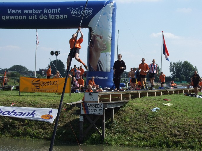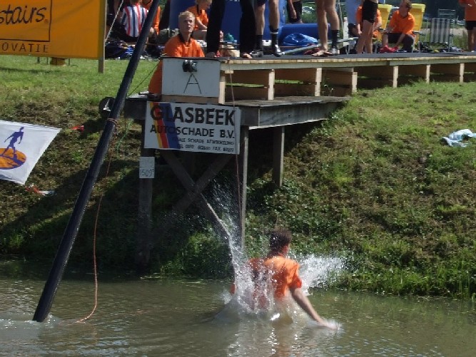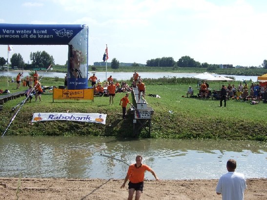 | オランダの伝統的なスポーツで「フィーエルヤッペン」という競技をご存じですか。棒を使って運河をひとっ飛びする競技で、飛び越えた距離を競う競技であります。わかりやすく言いますと「棒幅跳び」というところです。これもオランダならではと思います。 訪れた日は、ホランド地区の選手権が開催されておりました。これまでの最高記録は20.6メートルだそうです。うまく飛び越えると写真中央のように砂場に着地することができ距離が計測されます。もちろん飛び越えられない場合は写真右のように運河の中にドボンとなります。選手権ということで、選手の表情も真剣そのものでした。 |