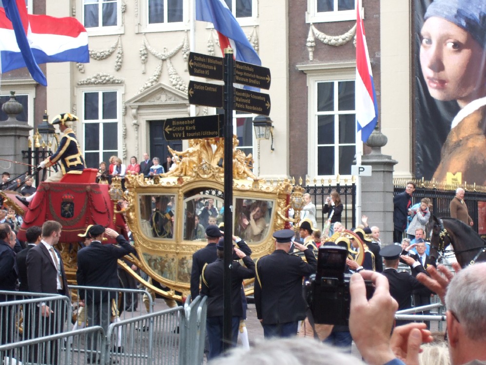 | 毎年9月オランダの国会開会の際に、女王が今年度のオランダの国家の方針を読み上げる「Prinsjesdag」という行事が行われます。併せて国会周辺を黄金の馬車にのってパレードいたします。場所はハーグのビネンホフ後ろみえるフェルメールの絵画はマウリッツハイス美術館です。女王が到着するまでに騎馬隊や軍楽隊の行進がしばらく続き、黄金の馬車に乗る女王の姿を背の高いオランダ人をかきわけて撮影することができました。 本年の女王のスピーチの詳細はこちらから見ることができますが、環境問題が大きく取り上げられております。例えば「4年間に風力発電を2倍にする」とか「電車利用を1年で5%増やす」・・・・。面白いのは「スポーツでトップ10入りをする」というのもあります。オランダに暮らしていて、そう言えばオランダの色々なところで風力発電用の風車の建設現場を見ることができます。また、すぐには完成しませんが、電車やトラムなどの公共交通機関の整備も積極的に行われております。近い将来デルフト駅も地下化をするそうです。(デルフトの新駅舎のデザインも既に決まっております。詳細はまた次の機会にお知らせします。) |