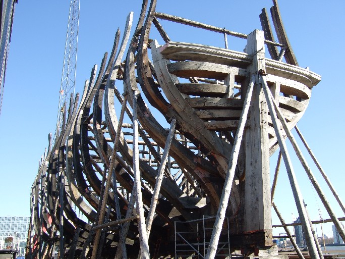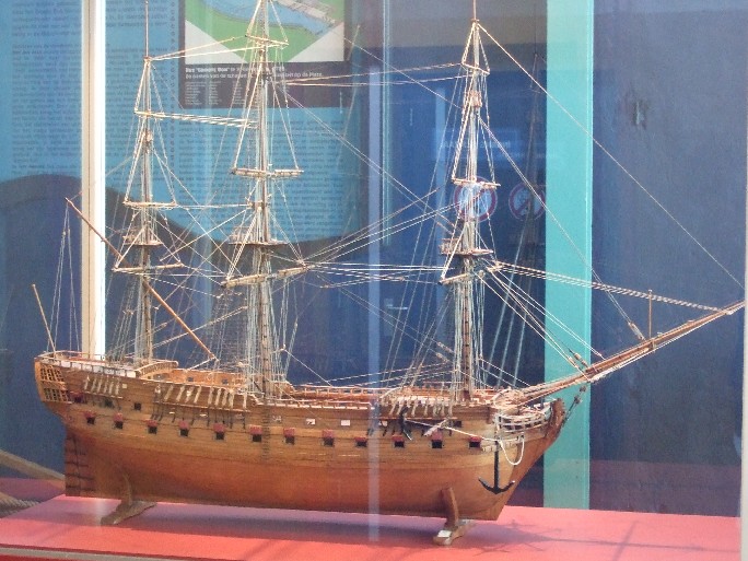 | 「デルフト号」の模型です。デルフト号は1783年に完成し、デルフスハーフェンの港から出港して行きましたが、イギリスとの闘いにより、1797年にスケベニンゲン沖に沈没してしまったそうです。現在は残された設計図を元にその復元作業が当時の手法により行われており、多くのベテランのシニア・ボランティアと学生がインターンシップの一環で一緒に働いているとのことです。復元作業は細かいところは残念ながら撮影が禁止されておりましたが、屋外での船体の組み立ては撮影が許可されており、63メートルの長さを持つデルフト号の骨組みが組み上がっておりました。2010頃を目処に完成予定だとボランティアの説明員の方から説明を受けました。歴史の事実を知ると一層興味がわいてきます。 |