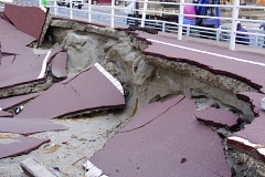 最初の被害現場は神奈川県横浜市の八景島付近で3月13日に調査に行きました。ここは平成14年に横浜市住宅供給公社が分譲したマンションであります。【写真・上左】のようにマンションのあいだの道路が液状化により沈下しており、植木も曲がっております。【写真・上中】は道路との段差が50cmほどありました。マンションへの被害は、一部の家で排水管が機能しておらず、仮設トイレも準備されておりました【写真・上右】。 【写真・中左】に見られるように左側のマンションと中央の道路は上述の通りであります。右側の駐車場はもとは沈下した道路と同じ高さであったそうです。この駐車場は地下に3層式となっており、液状化に伴う浮力で1.5m以上も持ち上がったようであります。【写真中中】を見ると左右の3層式の駐車場が一体化されていたため、一緒に持ち上げられたと考えられます。【写真・中右】は近くにある別の駐車場も同じように浮力で持ち上げられておりますが、こちらは左右が別々に設置されていたものと思われ、軽自動車が留まっている部分は持ち上げられておりません。 周辺の道路の状況は、【写真・下左、下中】のように大きな噴砂の跡くっきりと残っており、液状化の凄さを物語っております。噴砂により沈下した道路にクラックが入っている写真が【写真・下右】です。 現地では、市議会から木村ひさよし議員も視察に来られており、液状化現象の状況説明をいたしました。 (こちらでそのときの写真を見ることができます) |