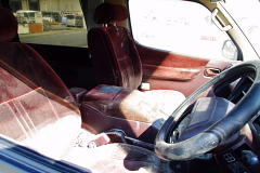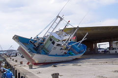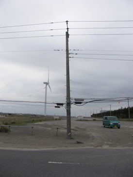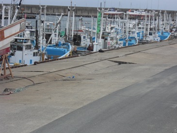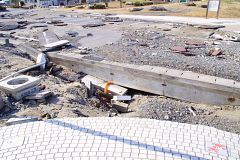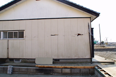 【写真・下左】は漁港から80メートルほど離れた地点にあるコンビニエンスストアの倉庫です。津波の後が壁面にくっきり残っており、この地点で1.5メートルほどであります。【写真・下中】は付近にある電柱です。歩行者用押しボタンが地面すれすれにあるということは、50センチほどが地面に潜り込んでしまったようであります。【写真・下右】は漁港に駐車してあった車の内部を撮影したもので、砂まみれになっている状況でありました。地震発生時も駐車されていたようで、目撃者の話では津波により100メートル近く移動していたそうです。 |