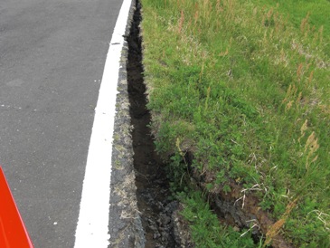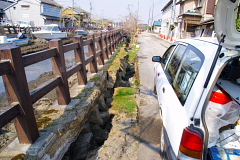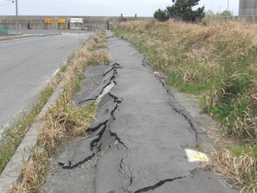 北浦を横断して鹿島と行方を結ぶ「鹿行大橋」が落橋して1名の犠牲者が出たそうです。【写真・上左】は橋と取り付け道路の境界に立てられた通行止めのフェンスであります。写真からもわかるとおり段差が1メートルほどに及んでおり、手前の道路が大きな沈下が起こっていることがわかります。【写真・上中】に見えるように落橋した箇所は中央部であります。近くまで行くことはできませんでした。橋の北側に新しい橋が建設されている途中であり、こちらにも被害が生じたようであります【写真・上右】。現在は新(工事中)・旧(被災)の橋が共に通行することができないため、北側か南側を迂回しなければならない状況であります。【写真・下左】は付近の堤防の被害状況であります。のり面がブロックごとに滑ってしまっている状況であります。【写真・下中・下右】は道路沿いにできた亀裂であります。その大きさは幅15〜20センチに及んでおりました。 |