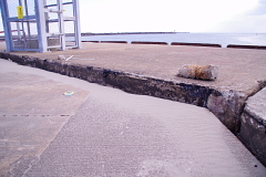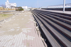 | 【写真・上左】は鹿島アントラーズのクラブハウスから海方面に行く途中で護岸が崩壊している箇所がありました。周囲は工場地帯であるため復旧の優先順位が高くなかったものと思われます。【写真・上中】も同じ箇所でありますが、歩道下には埋設管があるため注意を促す張り紙がされていました。歩道の歪みも埋設管の浮上によるものであると推測されます。【写真・上右】は海岸線に設置された防波堤の修繕が行われていました。古い防波堤を一度壊してから新しいものを作るようであります。【写真・下左】は鹿島灘漁協付近の岸壁でありますが、液状化による側方流動によって岸壁ブロックが海の方向に押し出されていることがわかる。また、その背面ではブロックが沈下している様子が【写真・下中】から理解できる。【写真・下右】は液状化により沈下した電信柱であります。電線と地面の隙間は乗用車1台が通れる高さになってしまっていました。 |