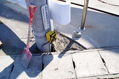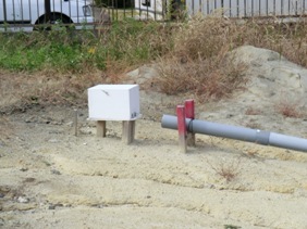 【写真・下左】も小野川沿い被害状況であり、道路の沈下や噴砂が見られました。【写真・下中】小野川に注ぐ水路でありますが、小野川と同じように両岸からの土砂で水路が埋まってしまったようであります(現在は中央部だけ掘り割りが入れられております)。【写真・下右】は佐原中学校のテニスコートを金網越しに撮影をしたものでありますが、テニスコート状に大きな噴砂の跡が何箇所も残されておりました。 |