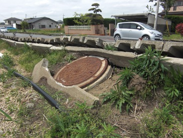 | 5月5日に東関東自動車道・潮来インターそばの日の出地区に調査に向かいました。道路には砂利が敷かれていたり、復旧工事が行われているおりましたが、【写真・上左】のように電柱は依然道路側に傾いたままでありました。【写真・上中】は住宅側に今にも倒れそうな状況の電柱であります。この住宅はブッロク塀が液状化により沈下しており、至るところに、段差やクラックが見られました。家の外周には「圧送管」と書かれた汚水管が設置されており、緊急的な復旧は終了しているようでありました。【写真・上右】と【写真・下左】は、歩道の下にある側溝が浮力で持ち上げられている状況であります。持ち上げられたコンクリートブロックの裏側もマンホールが被害を受けていました。【写真・下中】は学校のグラウンドにアスファルトなどの瓦礫が山積みされていました。がんばろう!!日の出【写真・下右】 |