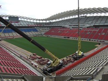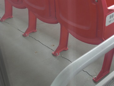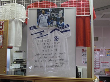 | 【写真・上左】潮来から北上して鹿島サッカースタジアムに行きました。スタジアム周囲の被災状況は【写真・上中】の写真に見られるとおり外周部のアスファルトに亀裂が見られる程度でありました。駐車場も液状化は起こらなかったようであります。スタジアムの中に入ると、【写真・上右】のとおりピッチも無被害ですぐにでも試合ができる状態でありました。しかしながら【写真・下左】のような工事が行われていました。これは屋根に取り付けられていた照明装置を四隅の2階席に移設する工事だそうで、被害を受けたということではなく、観客の安全を考えて行われているそうです。その他にも【写真・下中】のように観客席を固定しているコンクリートにクラックが入っており、6月のホーム開幕に向けて急ピッチで作業が進められていました。スタジアムから車で10分ほどの場所にある鹿島アントラーズのクラブハウス周辺は液状化によるマンホールの飛び出しや道路の沈下などの被害が見られました。【写真・下右】はテレビCMでも有名になったシャルケの内田篤人選手(2010年まで鹿島アントラーズ所属)の大震災被災者への激励メッセージが書かれたユニフォームがクラブハウスに展示されていました。 |
