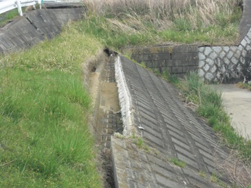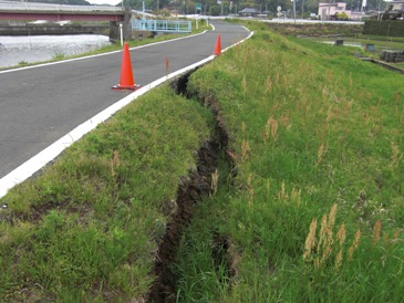 【写真・下左・中】はさらに上流に行ったところで崩壊していた堤防であります。中段の写真の状況と同じように川側に堤防が押し出されており、天端の地盤には大きなクラックが入っておりました。【写真・下右】はさらに上流に架かる湊大橋でありますが、調査日現在でも車両通行止めという状況でありました。(被害の程度は不明ですが、橋脚にひび割れが入っているそうです。こちら)